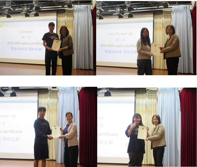 We extend our sincere congratulations to all participating classes and award winners. Each team’s enthusiasm, creativity, and dedication truly lit up the stage at K1, making the event a memorable experience for everyone involved. Special thanks are also extended to our three judges—Professor Elena Yakovleva, Professor Yi-Chi Liu, and Professor Lori Wang—for their professional and thoughtful evaluations. Their support played an essential role in encouraging students to continue contributing to departmental activities such as drama and theatrical performances. Last but not least, the Department would like to express its heartfelt appreciation to the organizing committee, the English Association of Junior College, whose dedication and coordination ensured the smooth execution of the event.